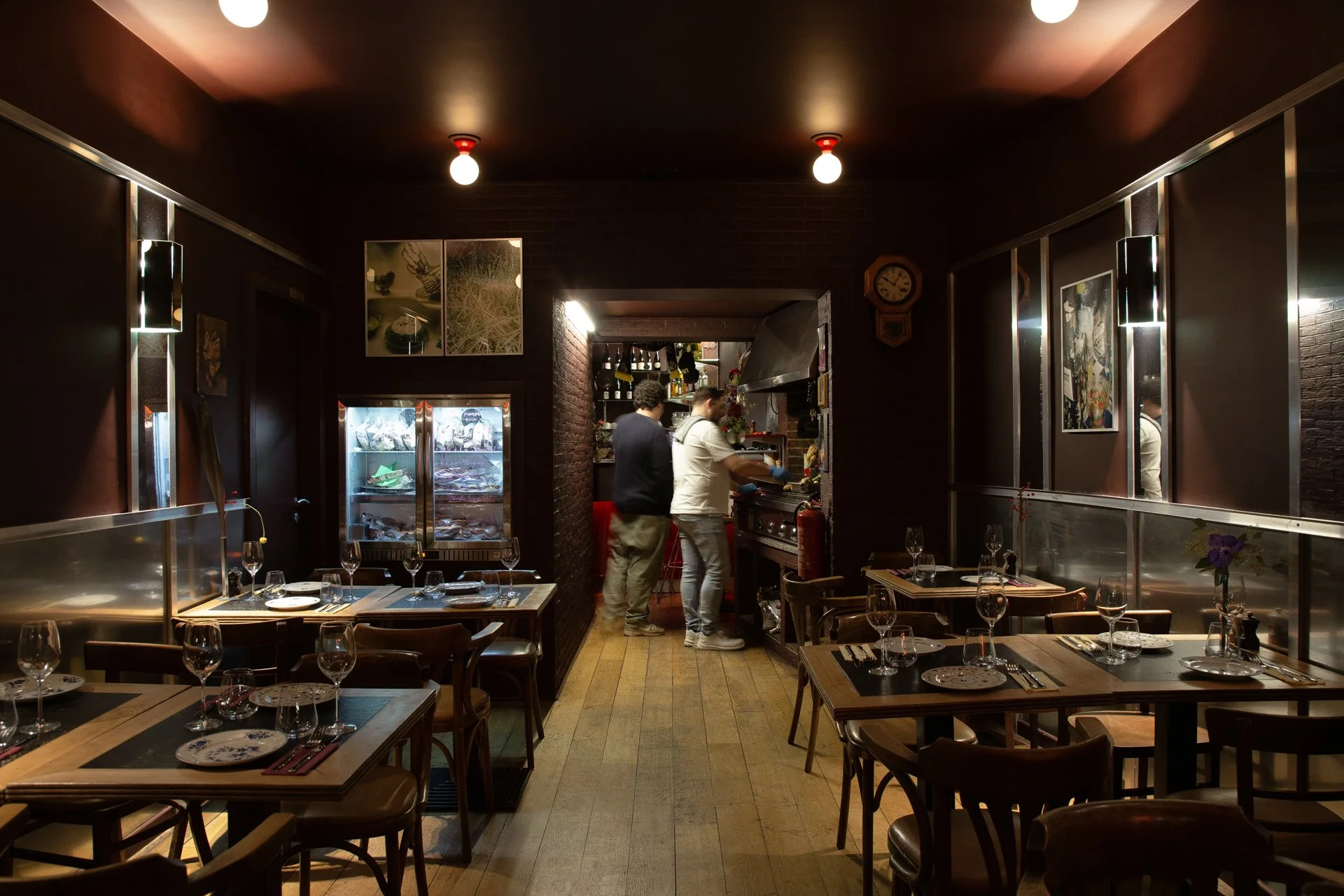 As for materials and ambiance, we thought bistro/butcher’s place. A mix between the warmth of the wood and the colour of the walls, and the metallic.